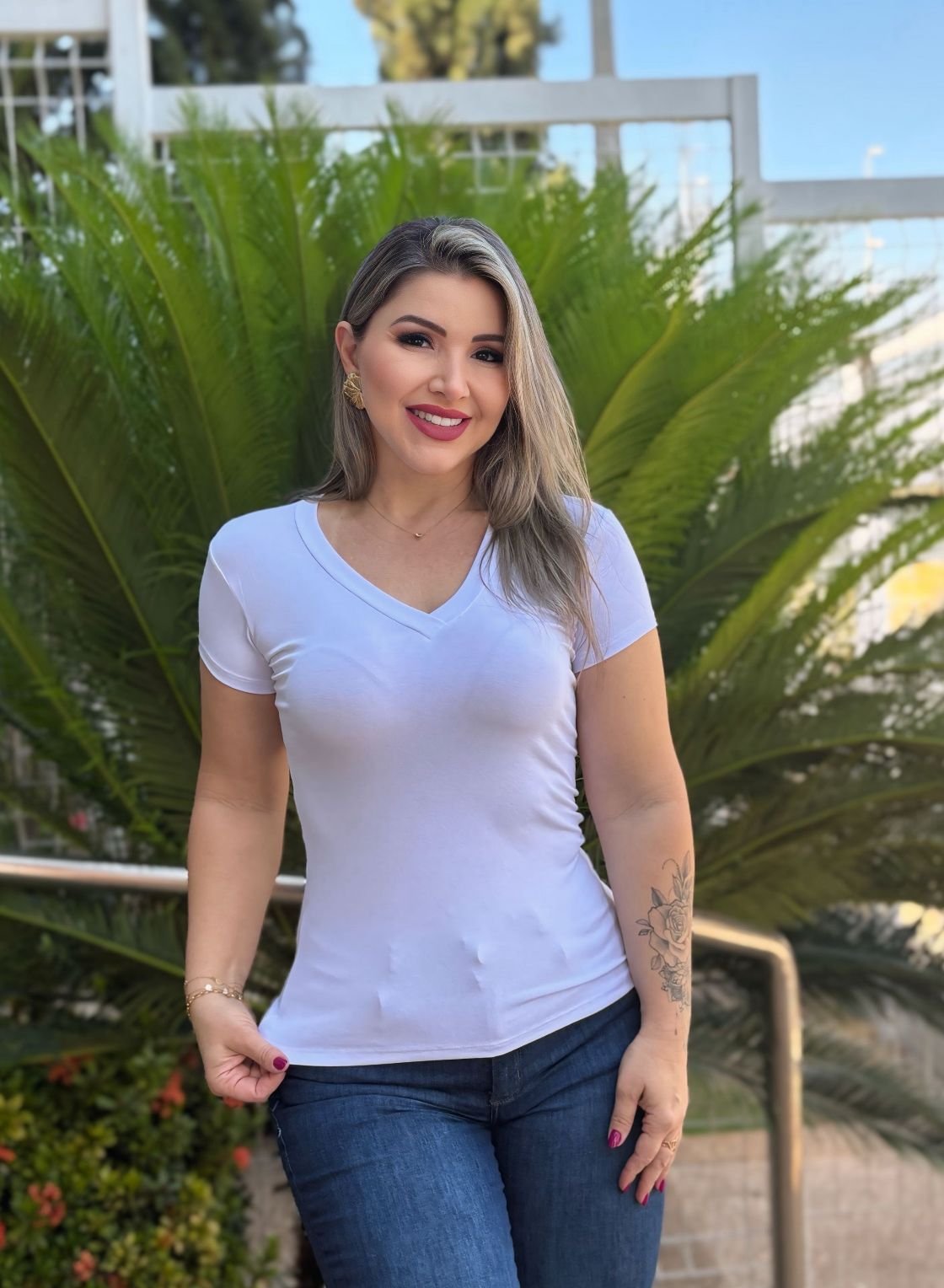 A blusa básica é aquela peça clássica e atemporal, obrigatória no guarda-roupa feminino. Com toque macio e leve, proporciona satisfação ao vestir, além de um caimento ajustado perfeito. A versão com decote V ainda eleva o visual básico e valoriza o colo da mulher.