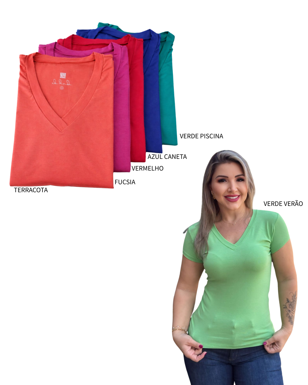 Dicas de Uso: As básicas são ideais para compor todos os tipos de looks, use sua imaginação e aposte com calças, shorts ou saias da coleção para um visual completo!